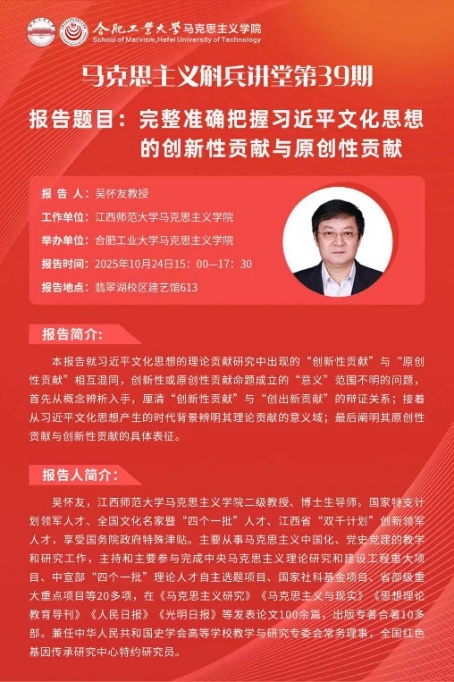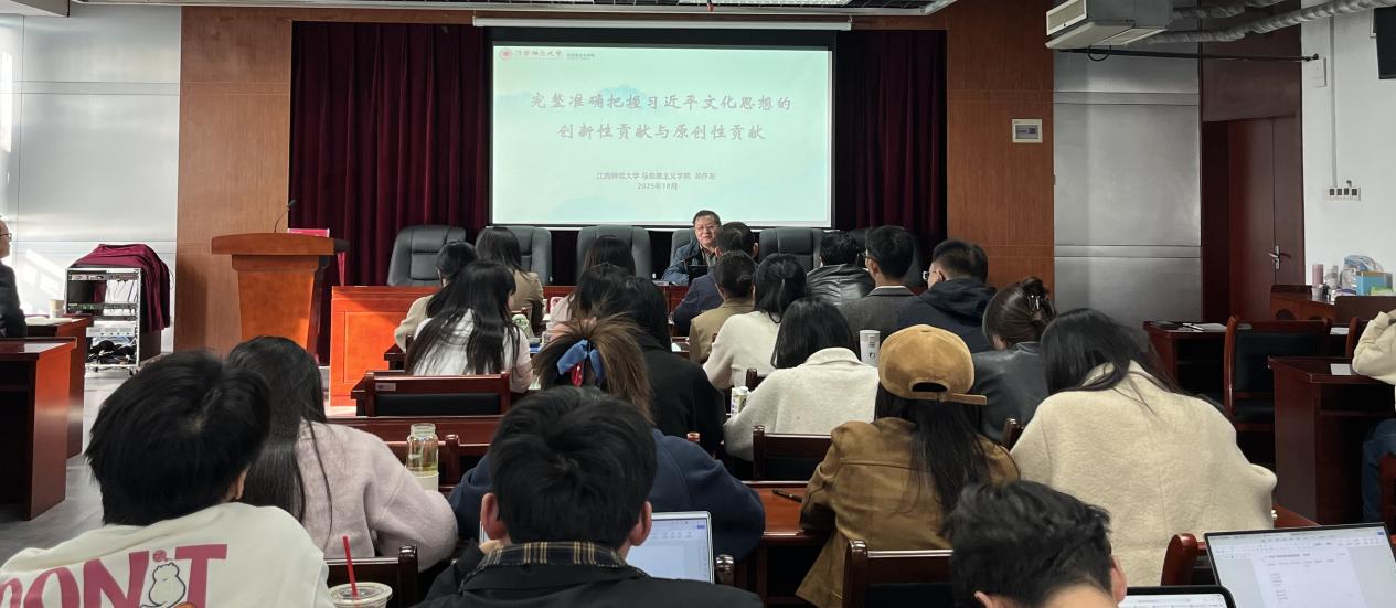 2025年10月24日,我院“马克思主义斛兵讲堂第39期”成功举办。江西师范大学马克思主义学院吴怀友教授来我院做了“完整准确把握习近平文化思想的创新性贡献与原创性贡献”的报告。讲座由牛小侠院长主持,部分师生参加此次报告会。