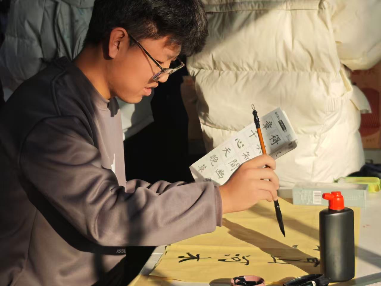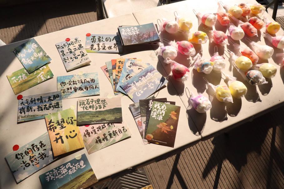 书法创作体验区静谧雅致,现场备好笔墨纸砚,工作人员为有需求的同学讲解握笔、运笔基础技巧。同学们或临摹经典诗词名句,或书写心中感悟箴言,笔墨流转间,浮躁心绪逐渐平复,专注力慢慢提升。一笔一划的勾勒不仅是对传统书法艺术的浅尝实践,更成为情绪沉淀的载体,让大家在沉浸式创作中舒缓焦虑,收获内心的宁静与笃定。