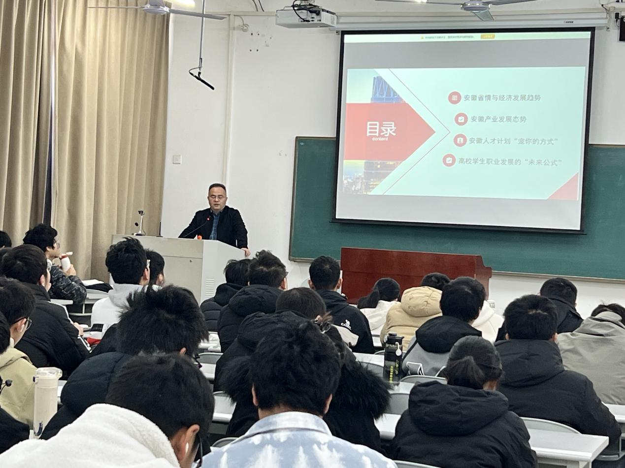 讲座中,程明老师紧密结合安徽省情与经济发展实际,从三个维度为同学们系统阐释了职业发展规划的科学路径。在自我认知层面,他引导学生盘点硬软技能、匹配兴趣价值观、契合性格特质,帮助学生明确未来适合的岗位方向;在外部环境研判层面,他深入分析了安徽当前产业发展态势和人才计划,建议学生把握行业"政策红利",依托平台资源优势,积累"核心竞争力";在长期发展层面,他创新性地提出职业成长"三期进级"法则,即从入门期夯实基础、到成长期打造专长、再到突破期向管理/专家/跨界方向跃迁、最终在成熟期建立行业影响力的发展路径,鼓励同学们做一个热爱生活、持续成长的人。