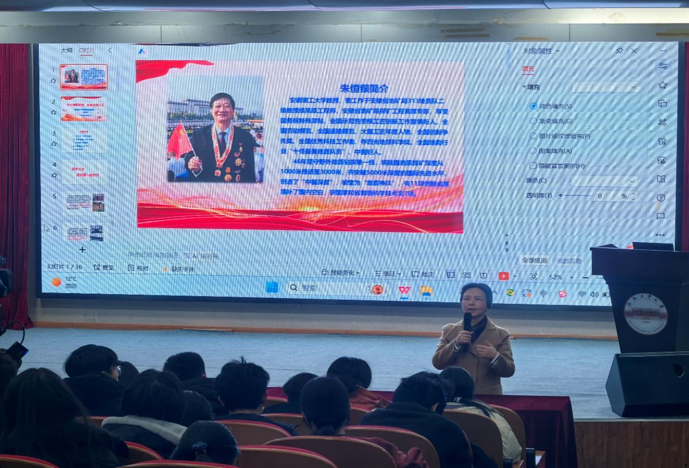 朱恒银教授以“匠心铸就梦想,创新点亮人生”为题,结合个人成长与工作历程,生动讲述了自己白手起家、扎根地质一线的奋斗故事。艰难困厄中砥砺前行、平凡岗位上追求卓越、单位低谷期勇挑重担、物质诱惑前初心如磐,如今他更以“老骥伏枥,志在千里”自勉,用始终如一的坚守和执着诠释地质人的责任与担当。同时,他深情寄语年轻学生,秉承合肥工业大学“厚德、笃学、崇实、尚新”的校训,牢记习近平总书记考察安徽时的殷切嘱托,将个人理想追求融入党和国家的事业之中,为中华民族复兴大业贡献力量。