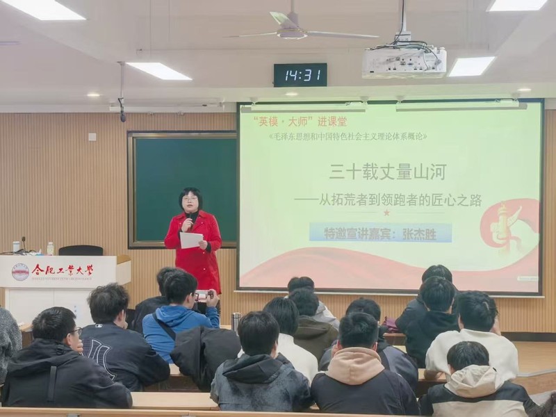 2026年3月30日下午,由合肥工业大学马克思主义学院举办的“英模・大师进课堂”系列专题活动,在屯溪路校区西二教学楼301教室《毛泽东思想和中国特色社会主义理论体系概论》课堂如期举行。全国劳动模范、全国五一劳动奖章获得者、中铁四局一级专家张杰胜受邀走进课堂,以《三十载丈量山河——从拓荒者到领跑者的匠心之路》为题,为青年学子带来一堂有深度、有温度、有力度的思政大课,《毛概》授课老师汪士主持报告,并和同学一起深入聆听这堂精彩的思政课。